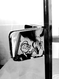 We (me and my beats) like to take walks down to our local coffee shop. Standing in line , the elbow joint supporters to the glass centerpiece that houses fresh baked pastries, (caged if you will. Confined, jailed. Separating us from the physical touch, but not our sight and smell). Are made of polished steel . The reflection caught my eye. Frame and press.